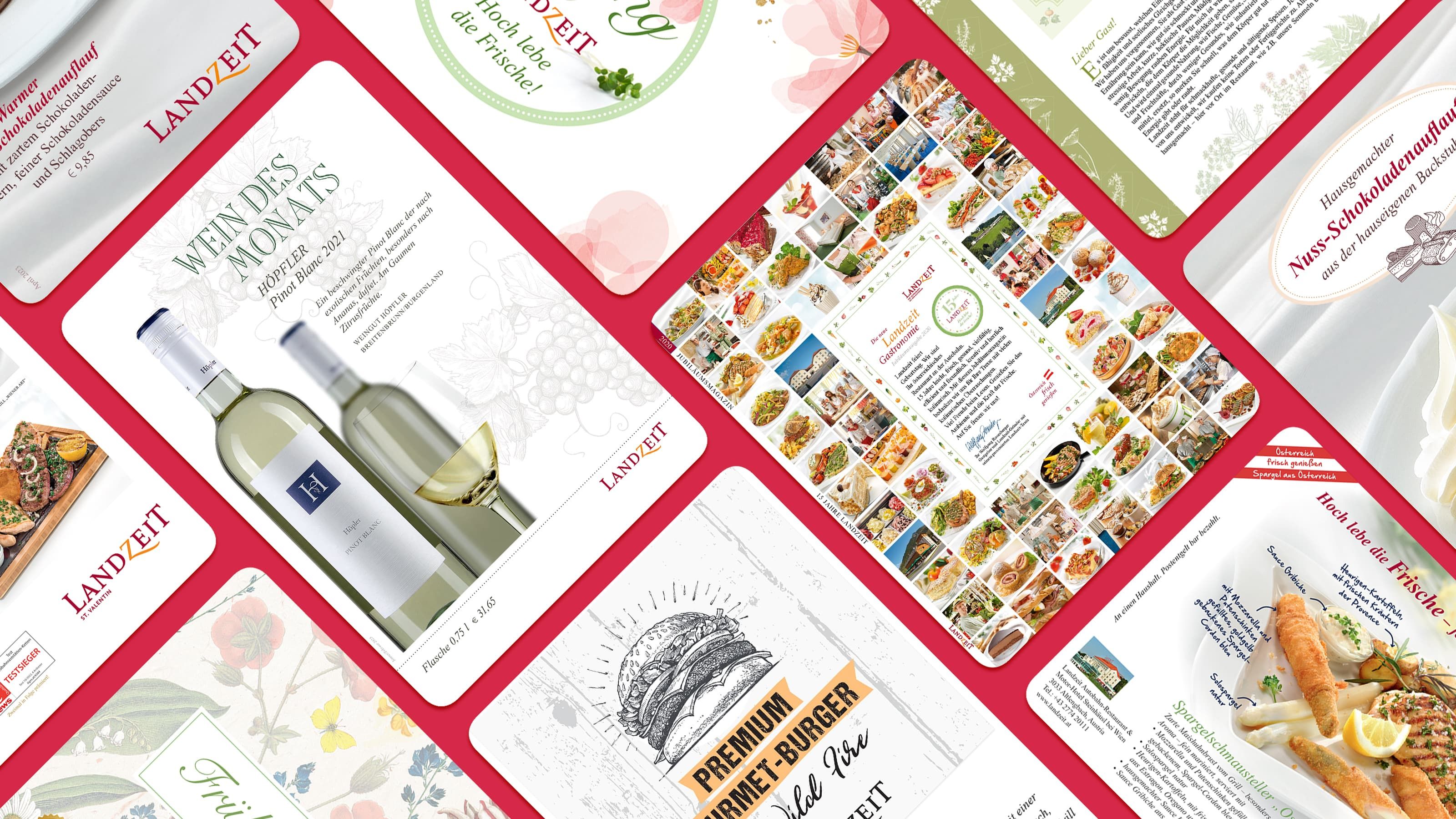 Speisekarten, Flyer und Tischkarten, Gastromagazine, Logo und Geschäftsdrucksorten, Werbeartikel, Website, E-Commerce, Newslettermarketing, etc.